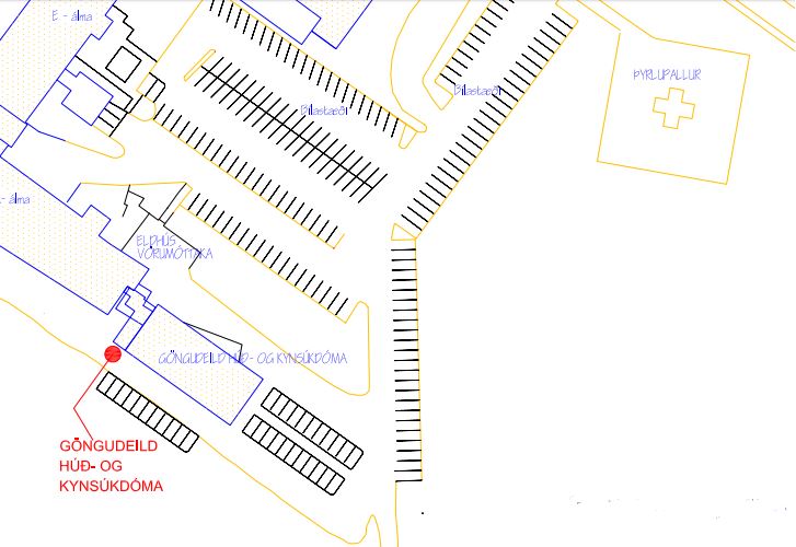 Örvarnar sýna leiðina frá göngudeild húð- og kynsjúkdóma í blóðrannsókn. Gengið er inn um Krókinn, aðalinngang Landspítala í Fossvogi. Þegar þangað er komiðer farið beint áfram að rannsóknarkjarna (E1 er til vinstri).