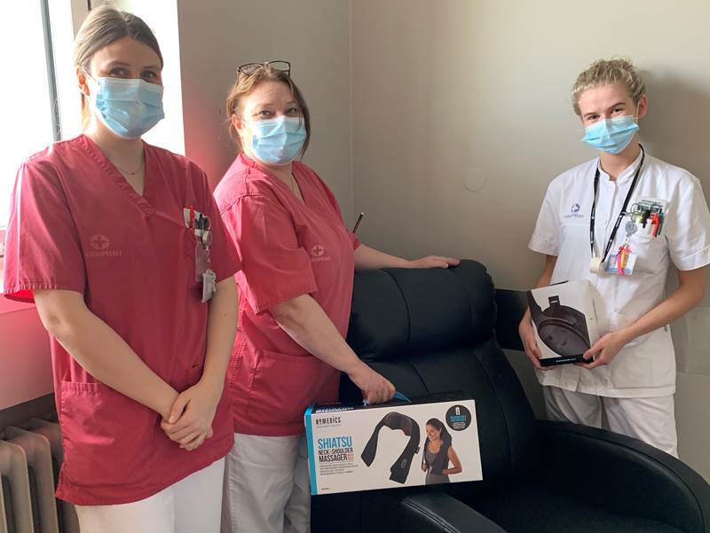 Tíu legudeildir í Fossvogi fengu rafknúinn hægindastóll, hjóðeinangrandi heyrnatól af bestu gerð, nuddtæki og þyngingarteppi, allt hugsað til að gera stutta hvíld og slökun aðgengilega á vaktinni og taka orkublundi á næturvaktinni.