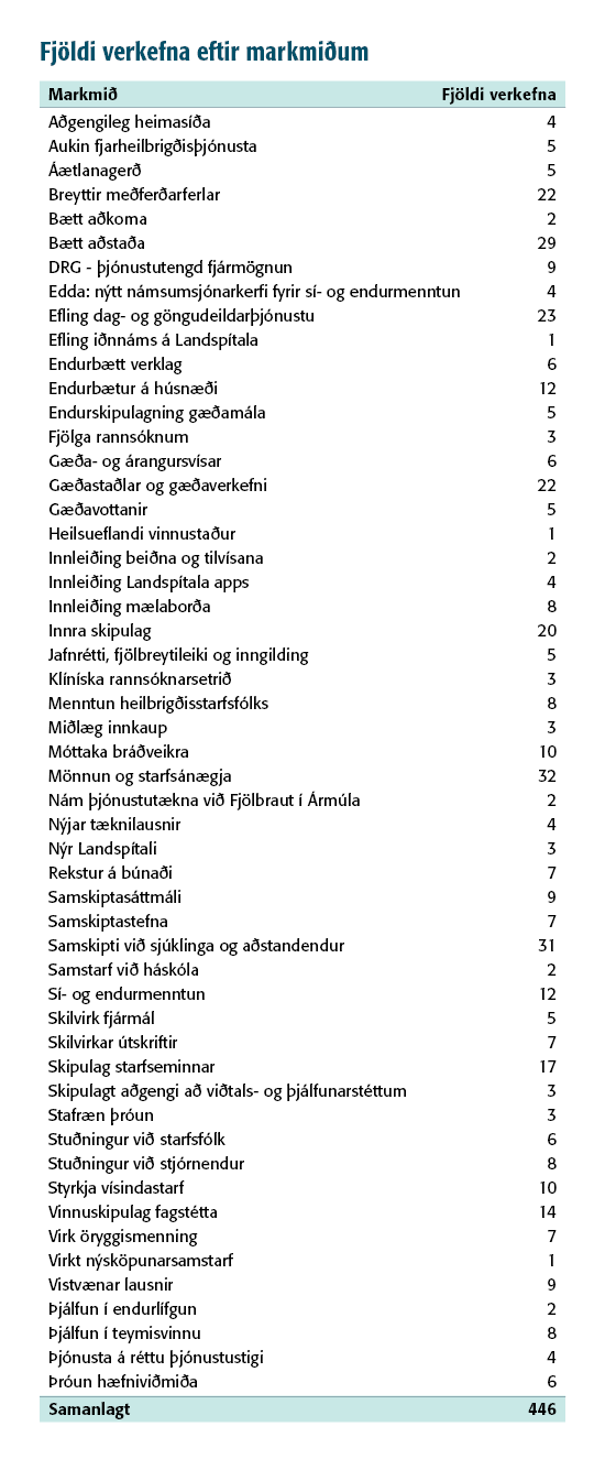 Starfsáætlun Landspítala fyrir árið 2024 er verkefnamiðuð og er unnin eftir stefnu Landspítala og áhersluatriðum hennar sem eru þjónusta, starfsfólk, þekking og umgjörð. Verkefnin eru tæplega 450 talsins og miða að ríflega fimmtíu markmiðum í starfsemi spítalans. Öll verkefnin eru þess eðlis að þeim eigi að vera hægt að ljúka á árinu 2024 en sum þeirra eru einnig liður í langtímaverkefnum sem eru til þess fallin að bæta þjónustu spítalans, auka skilvirkni og tryggja að sjúklingar fái bestu meðferð sem völ er á.