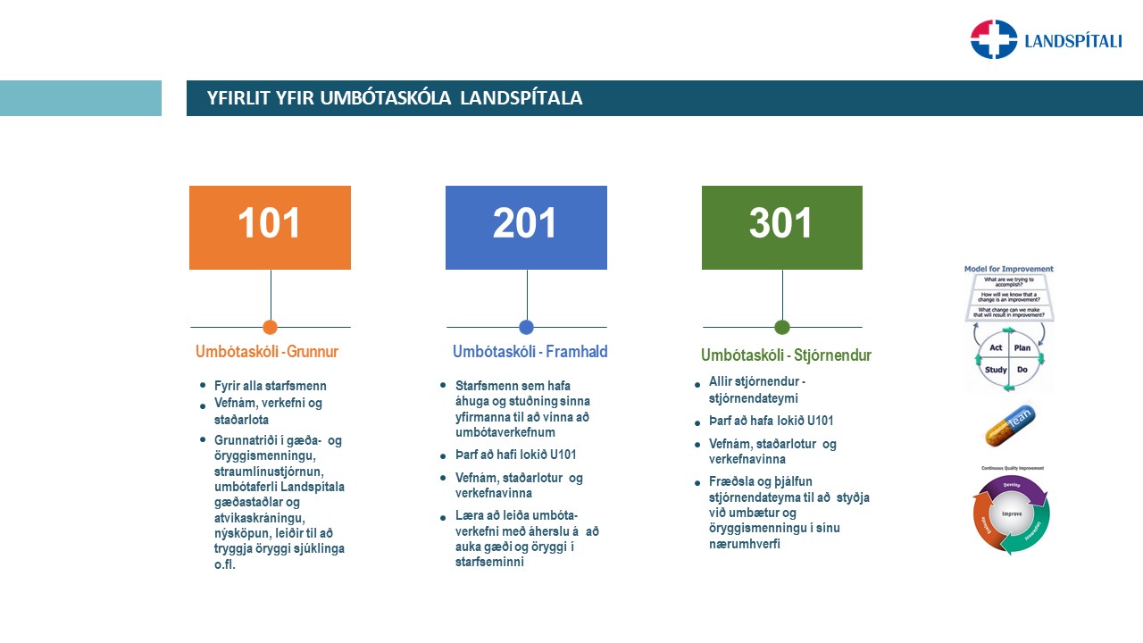 Námskeiðið varð til við sameiningu umbótaskóla 101 og 102, en umbótaþjálfun Landspítala er í stöðugri endurskoðun. Öll okkar umbótanámskeið byggja á fyrri lean námskeiðum þar sem áhersla var á að fræða starfsfólk um hugmyndafræði lean (straumlínustjórnunar).