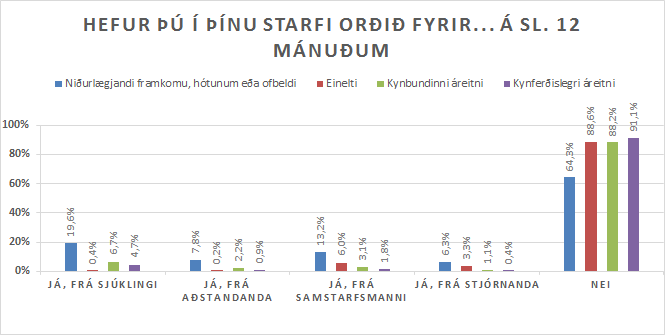 Þegar á heildina er litið er ljóst að sem betur fer hefur meirihluti starfsmanna ekki upplifað neina af þeim tegundum óæskilegrar hegðunar sem spurt var um á síðustu 12 mánuðum.